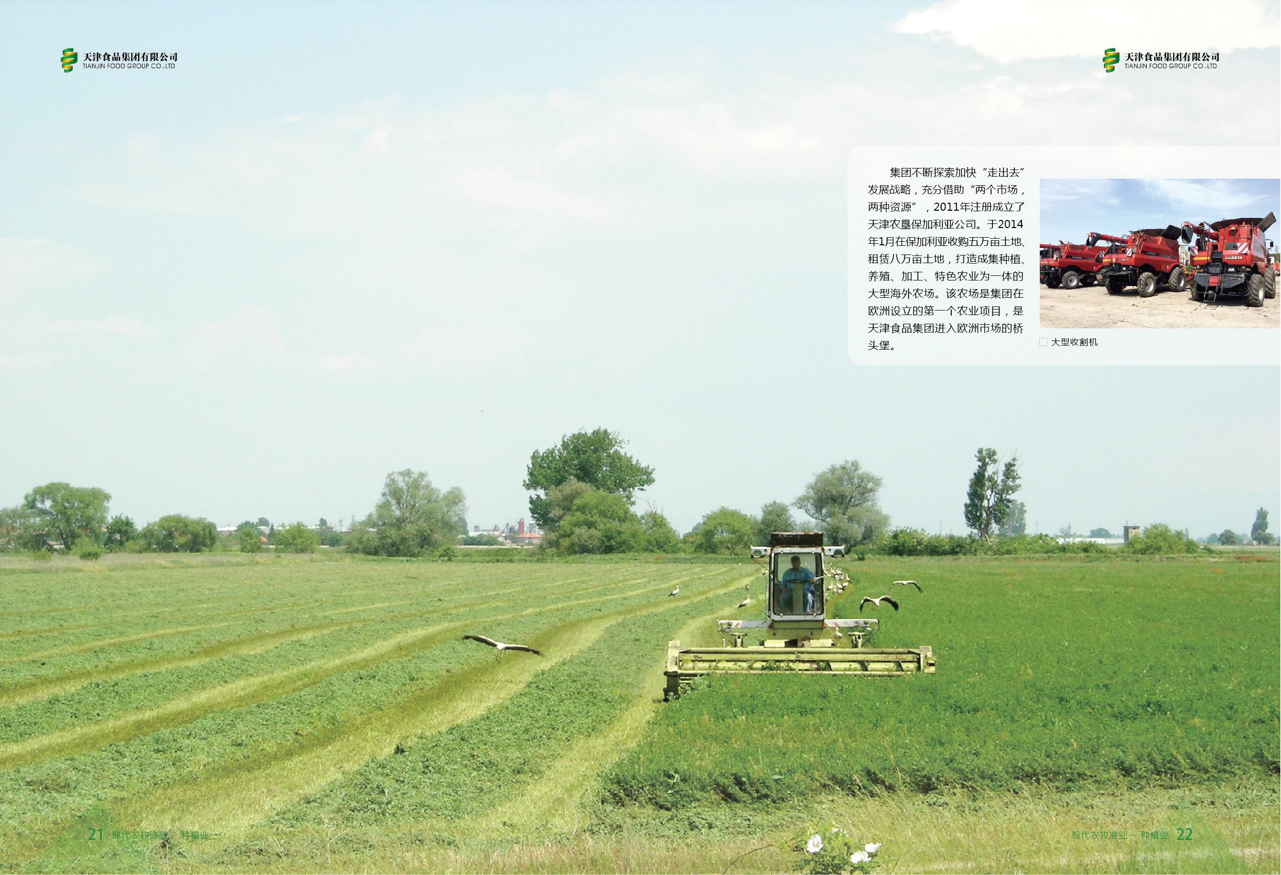 集團不斷探索加快“走出去”發(fā)展戰(zhàn)略,充分借助“兩個市場,兩種資源”,于2011年成立天津農(nóng)墾龍呈嘉益國際貿(mào)易有限公司,在保加利亞收購、租賃土地,打造成集種植、養(yǎng)殖、加工、特色農(nóng)業(yè)為一體的大型海外農(nóng)場。該農(nóng)場是集團在歐洲設(shè)立的第一個農(nóng)業(yè)項目,是天津食品集團進入歐洲市場的橋頭堡。The Group quickens its pace to implement the “going global” development strategy, and fully leverages the “two markets, two resources” advantage. In 2011, Tianjin Agriculture Reclamation Longcheng Jiayi International Trade Co., Ltd. was established. The company acquires and leases land in Bulgaria, and builds a large overseas farm that combines planting, breeding, processing and characteristic agriculture. The farm is the first agricultural project the Group launched in Europe, and is also the “bridgehead” for Tianjin Food Group to enter the European market.