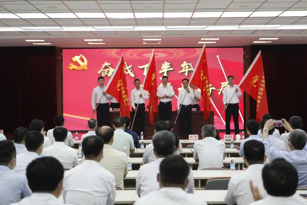 會議開始,萬守朋首先帶領全體參會黨員重溫入黨誓詞。會議通報了集團黨史學習教育階段成果,部署了近期重點工作,表彰了集團系統(tǒng)“兩優(yōu)一先”個人和集體,并啟動“奮戰(zhàn)下半年,確保開好局”活動。集團領導為獲獎代表頒獎,為黨員突擊隊代表授旗。